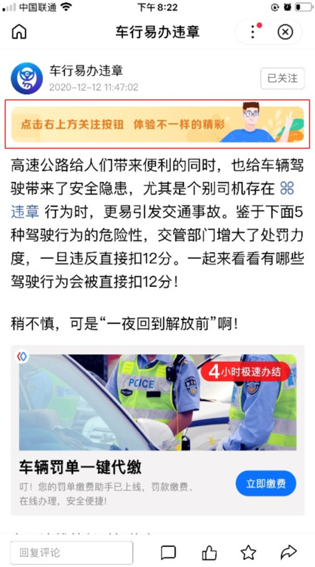 開發者創作內容的目的,一方面是要引導粉絲關注,引導粉絲關注是開發者與用戶建立起連接的一種重要手段,是沉淀粉絲群體,并對小程序用戶進行深度運營的基礎。圖文內容對于用戶關注動作進行有力引導,可以大大提升用戶關注率。除了系統默認的關注按鈕外,開發者還可以自己設置正文文首前的引導關注條的文案,引導用戶關注小程序。